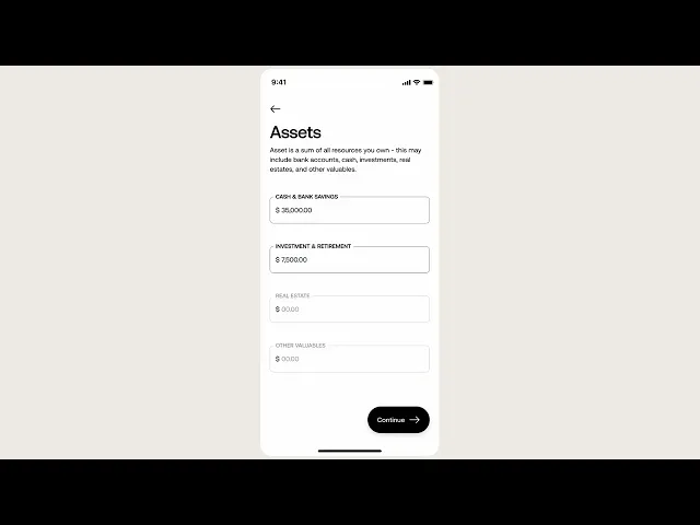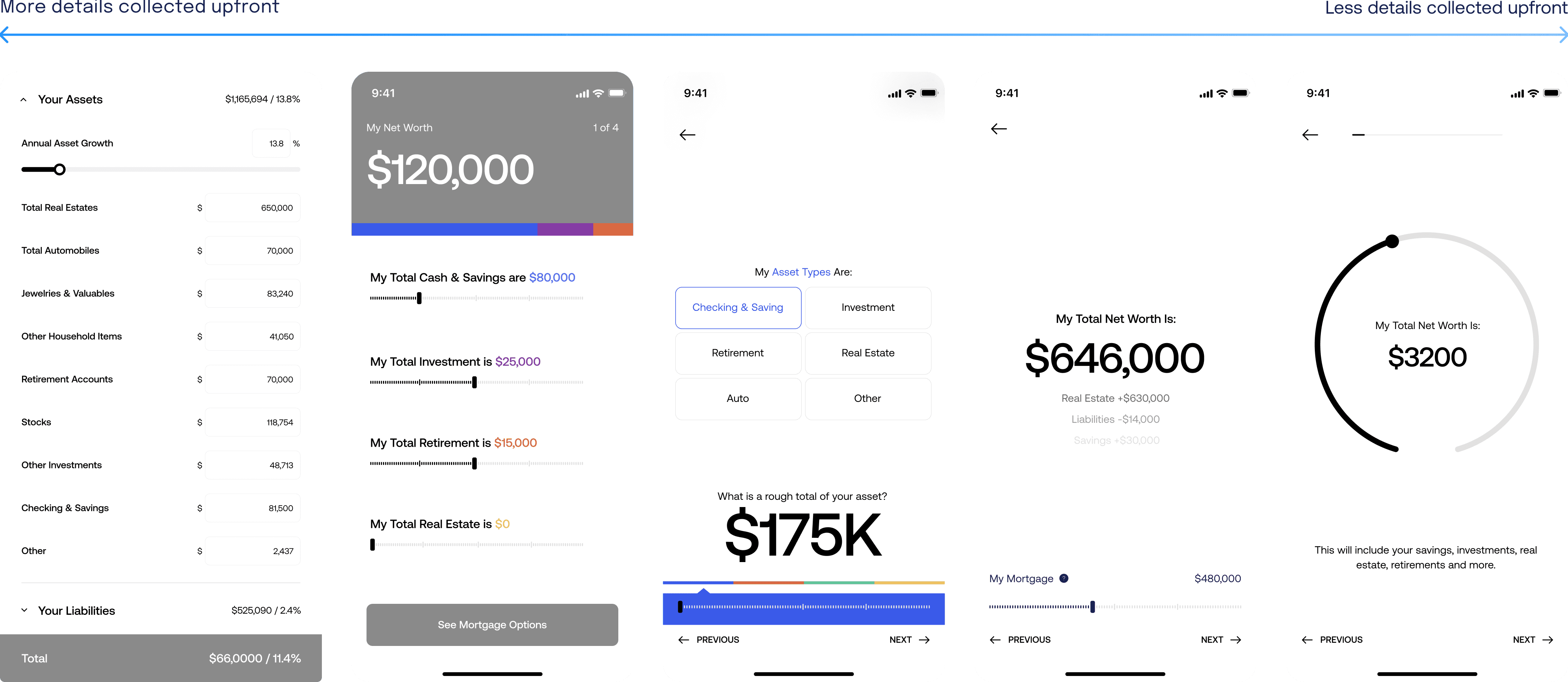 Instead of requiring exact figures, users are aked to provide rough estimates for assets, debts, and income via sliders, with the option to refine details later in the main experience.
